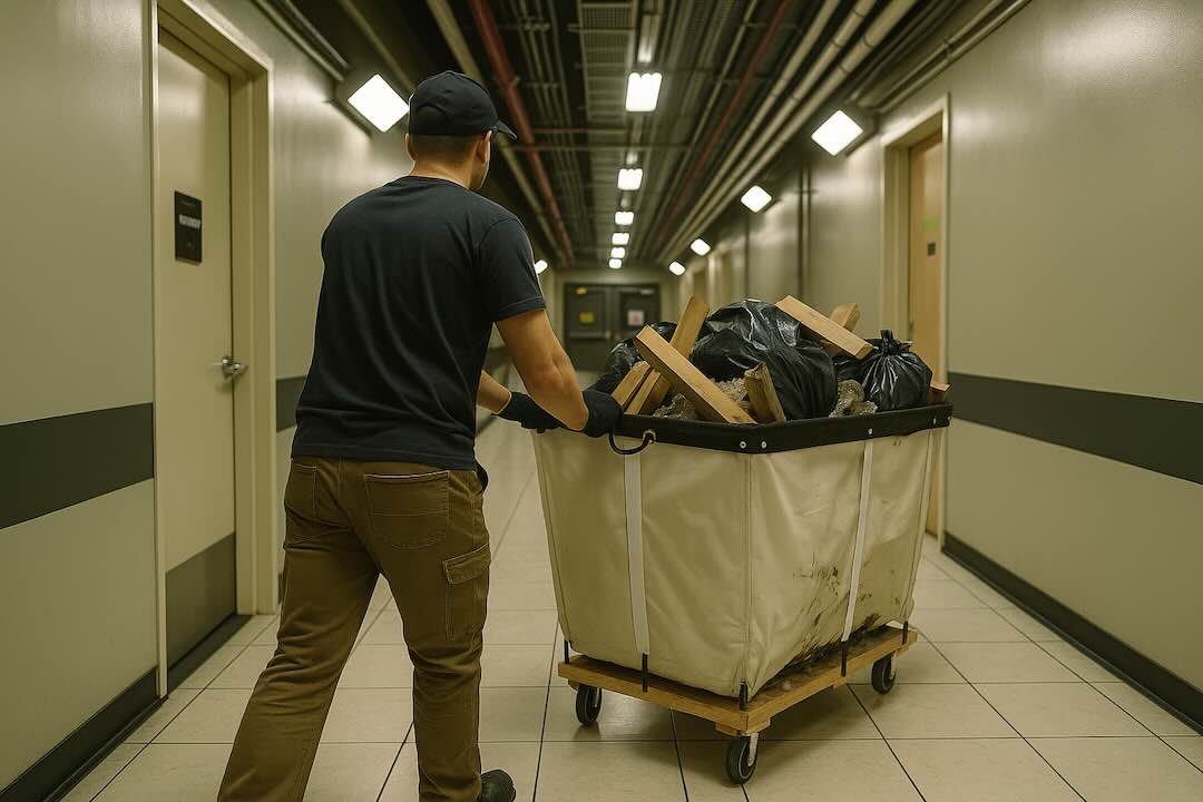 Tight space? No permits? No problem. We bag and discreetly roll out wood, drywall, plaster, and other jobsite waste using wipe bins and hand loadouts — no dumpster required.
