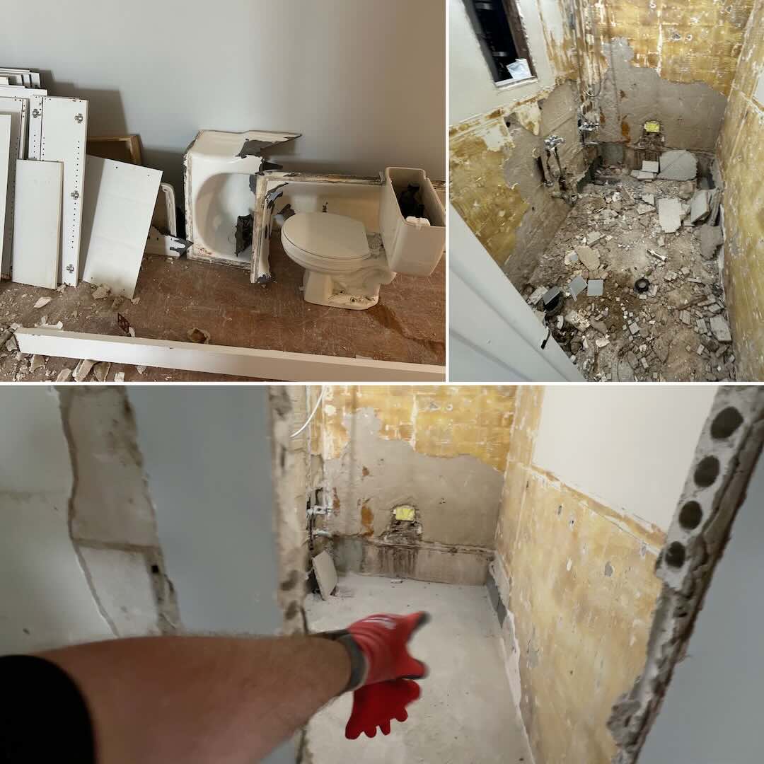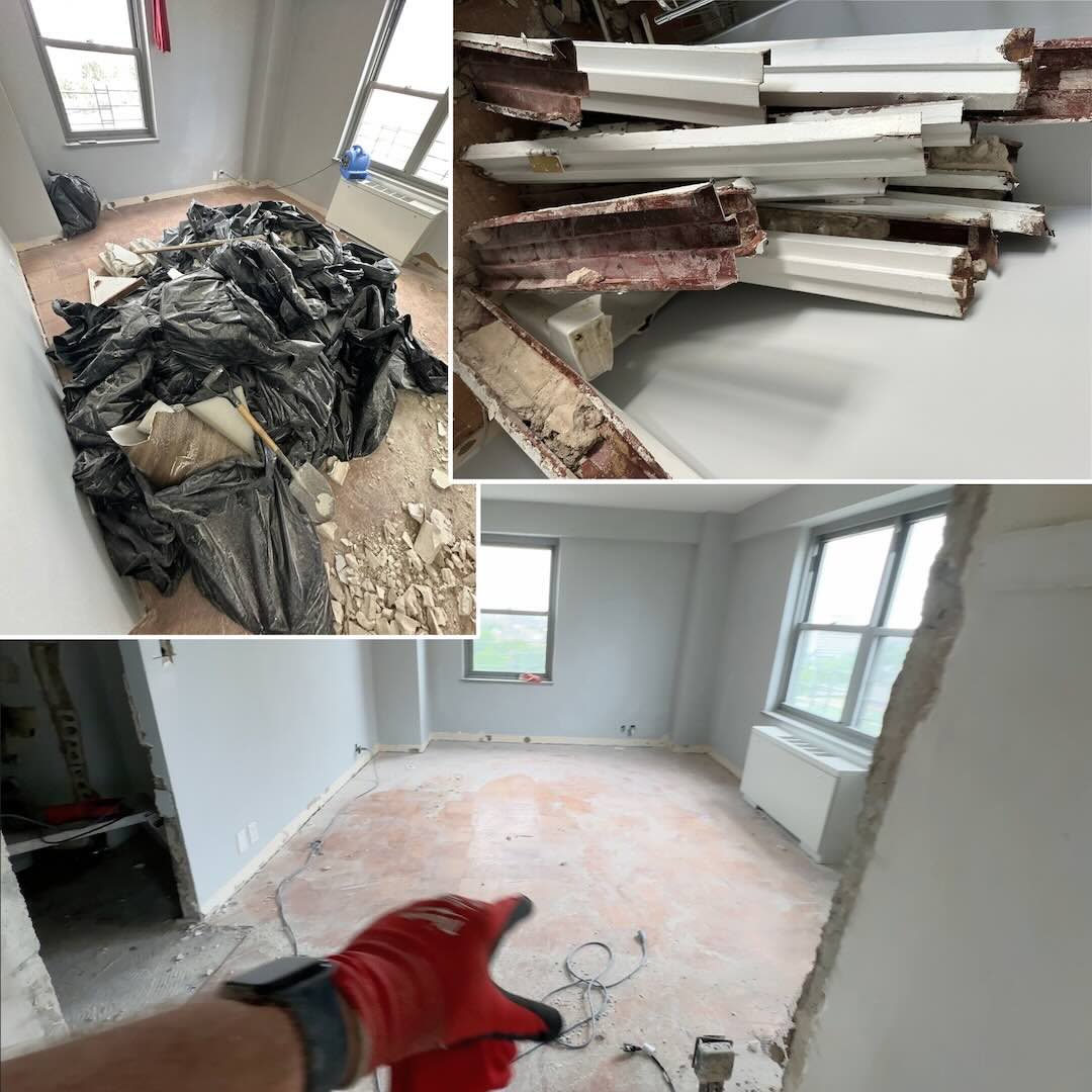 Full gut demo, kitchen demo, bath demo, non-structural removals, flooring/ceiling tear-outs, built-ins/cabinets, tile/mud beds, fixtures, radiators/cast-iron tubs. (No hazardous materials; structural/utility disconnects by licensed pros.)